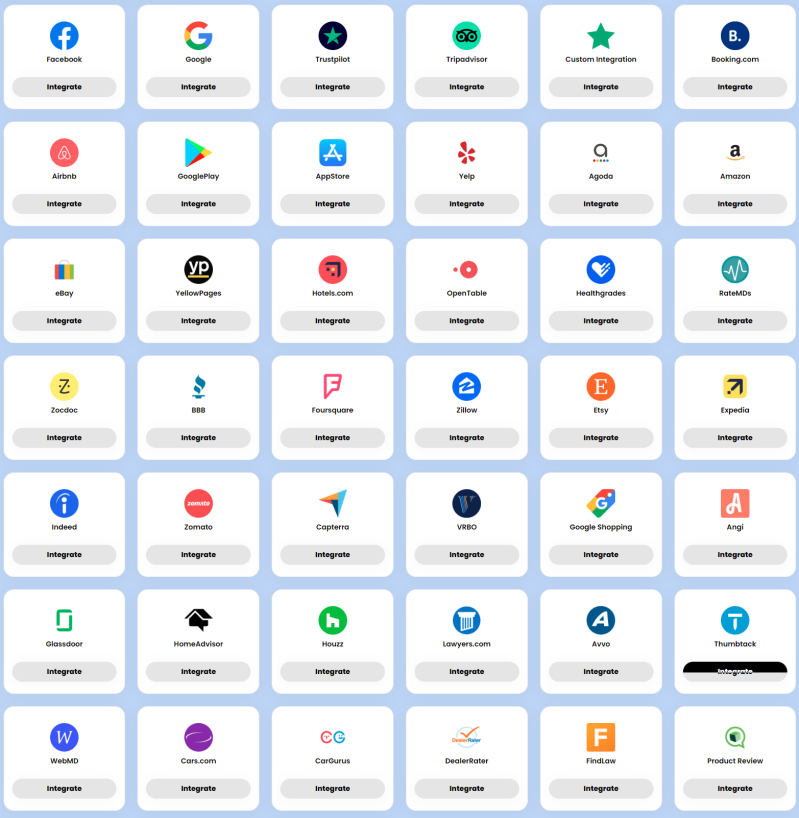 Below is a screenshot of all the integrations our review software can work with, so if interested, don't forget to contact us either by email or by booking a call. We will be more than happy to give you a quick tutorial on the software you will be using to help you with your positive reviews and reputation management endeavors.